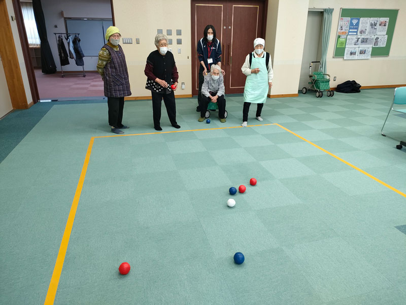 食事の前には、介護予防体操で体を動かし、その後はボッチャやビンゴ大会を楽しみました。参加者からは、「初めてボッチャをやってみてとても楽しかった。」「ビンゴ大会でほしかった景品がもらえてうれしかった」との感想があり、交流と笑顔の広がる一日となりました。