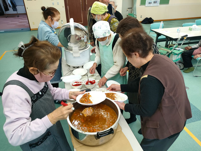 食事づくりには、森田地区母子寡婦福祉会員と森田地区シルバークラブ会員の皆さんが協力してくださいました。心をこめて作られたこの日のメニューは、うずらの卵入りカレーライス。参加者からは「とてもおいしい」と好評でした。